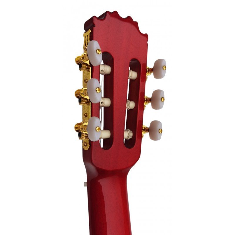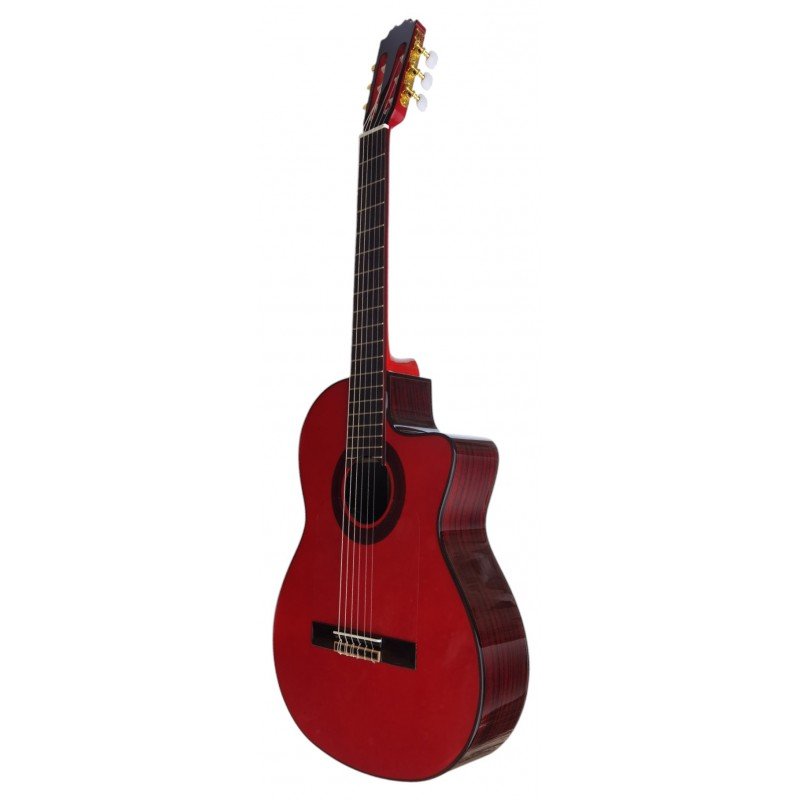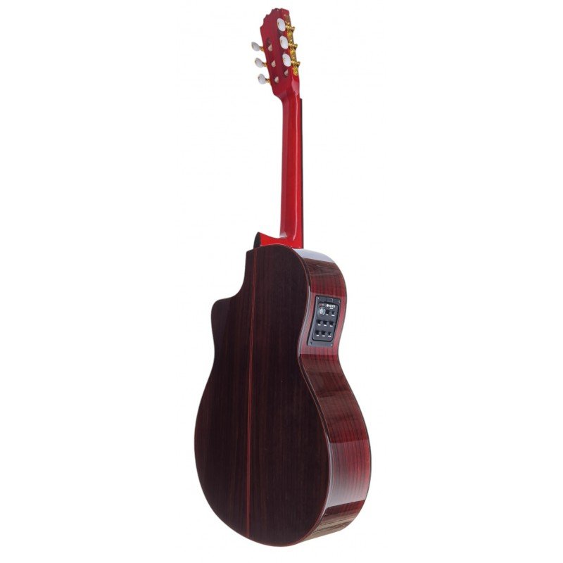Guitarra flamenca con fondo de sicomoro, una madera similar al ciprés. Tapa de abeto con golpeador. Amplificada con ecualizador y afinador. Con cutaway.