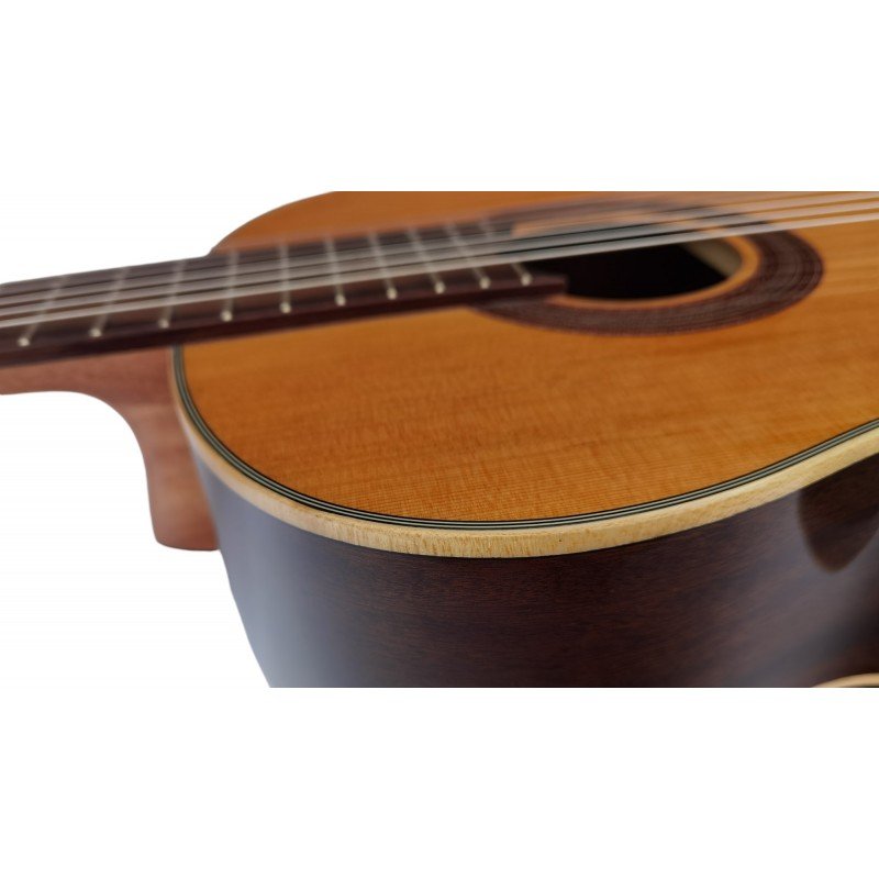 El modelo C320.A6 cuenta con una tapa maciza de cedro, que proporciona un tono rico y profundo, ideal para guitarristas que buscan calidad sonora y proyección. El acabado en brillo resalta la belleza natural de la madera, mientras que la cenefa decorativa alrededor de la tapa y el fondo de arce recrean fielmente el diseño tradicional del modelo T111.